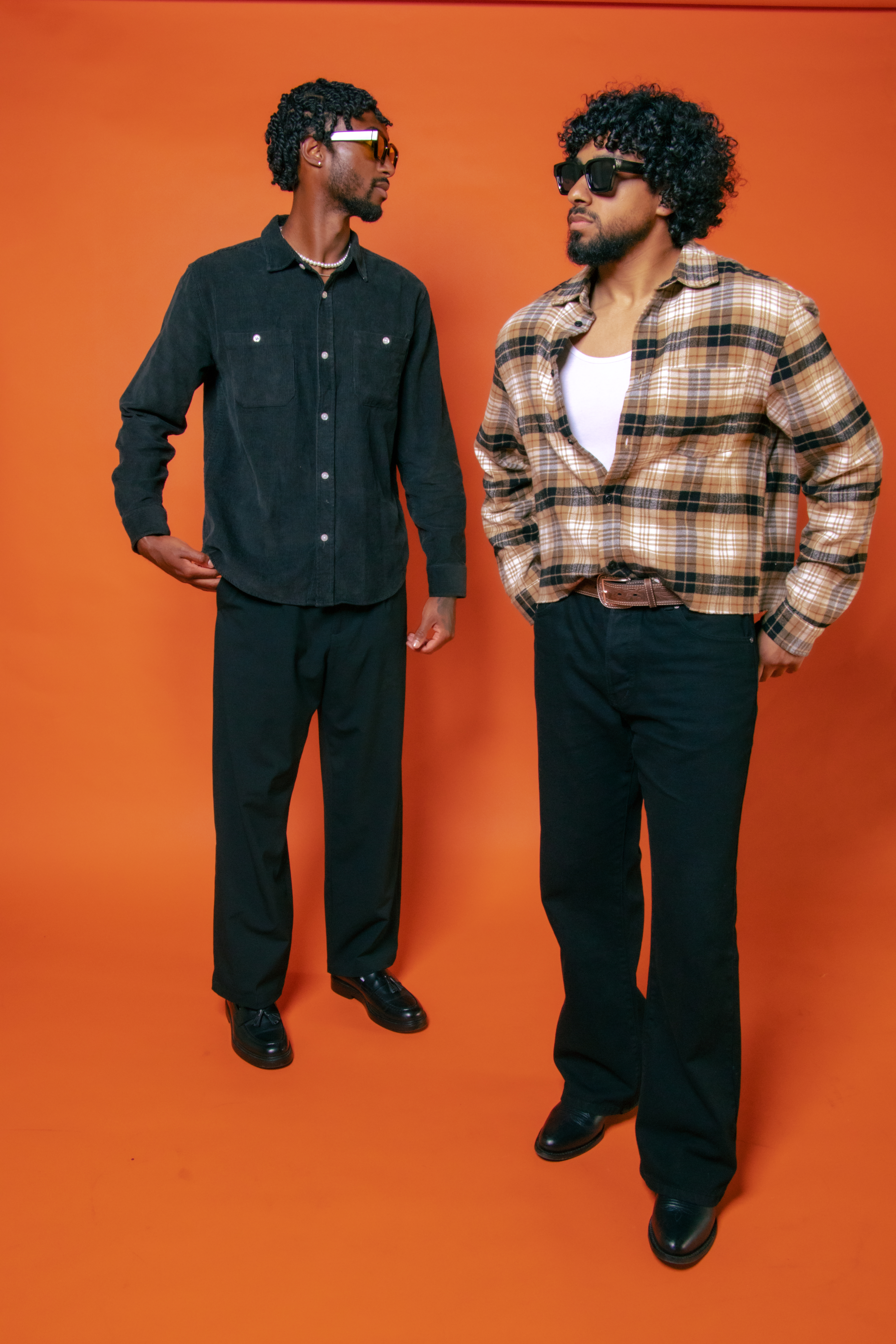 In this photoshoot, Anthony and Hassan capture the essence of a refined yet comfortable style, perfect for those Wednesdays when you want to blend workwear vibes with easygoing energy. Anthony, in an earthy brown top and tailored black pants, adds a touch of subtle sophistication to a casual day, while Hassan, in his plaid shirt and relaxed trousers, brings in that cool nonchalance we all aspire to by midweek.